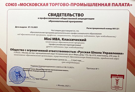 В рамках церемонии Русская Школа Управления получила Свидетельство об аккредитации образовательной программы дополнительного профессионального образования (профессиональная переподготовка) «Mini MBA. Классический».